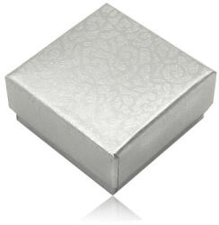 Ezüst színű, finoman barázdált ajándékdoboz fülbevalóhoz vagy egy gyűrűhöz. A doboz felületét sima ezüst színű ornamentumok díszítik. A doboz belsejében egy fehér párna található, amelyet az ékszer számára kialakított bemetszésekkel láttak el. Egy gyűrűhöz, fülbevalóhoz vagy egy medálhoz alkalmas. Méret: 50 x 20 x 50 mmMelső méret: 40 x 40 mm