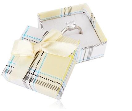Kockás mintás ajándékdobozka gyűrűre vagy fülbevalóra. A felülete sima , matt. A motívum sárgás - kékes - szürkés színű. A fedelét krém színű masni díszíti. A belsejében egy puha párnácska található. Méretek: 50 x 50 x 25 mmBelső méretek: 45 x 45 mm