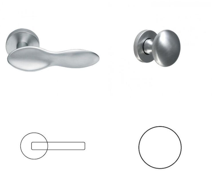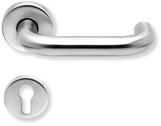 Rozettás rozsdamentes acél kilincs garnitúra. Metrikus menetes, átmenő csavaros (hüvelyes) a rögzítése, mely csavarok a felszerelést követően nem látszanak. A kilincs alaplapja rugót is tartalmaz, így a kilincs visszaemelése nem csak a zár feladata amelynél így hosszabb élettartam várható, valamint komfortosabban hat a működése. 72 vagy 90 mm-es zárral szerelt ajtókhoz j