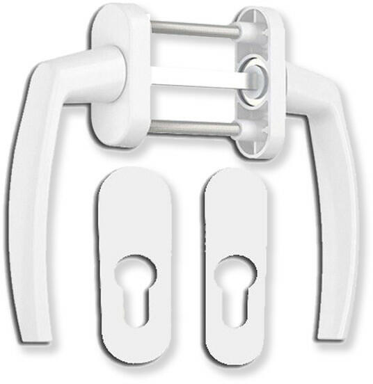 Victory erkélyajtó kilincsgarnitúra 2 db oválrozettával, fehér színben. Rögzítése belülről, 2 db átmenő csavarral történik oly módon, hogy a kilincs takaró lapját 90°-ban elfordítjuk a rögzítő lapról, majd rögzítést követően a lapot függőleges irányba visszapattintjuk. A külső oldali kilincs és rozetta keskenyebb, hogy az erkélyajtó bezárásakor elférjen egy