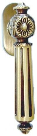 Egyedi megjelenésű kilincs. Aprólékosan kidolgozott formájával, antik színével, műemlék, műemlék jellegű épületekbe illeszthető.