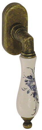 A kilincs egyedi patinás réz és porcelán párosítása különleges bájt kölcsönözhet egy stílusban illő ingatlannak. A betét törtfehér változatban is rendelhető.