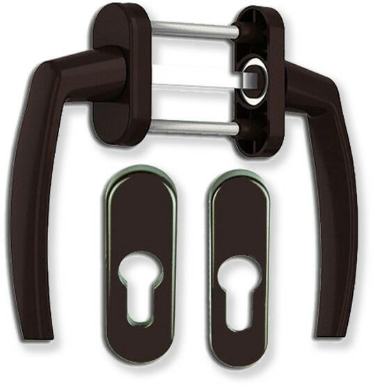 Victory erkélyajtó kilincsgarnitúra 2 db oválrozettával, barna színben. Rögzítése belülről, 2 db átmenő csavarral történik oly módon, hogy a kilincs takaró lapját 90°-ban elfordítjuk a rögzatő lapról, majd rögzítést követően a lapot függőleges irányba visszapattintjuk. A külső oldali kilincs és rozetta keskenyebb, hogy az erkélyajtó bezárásakor elférjen egym