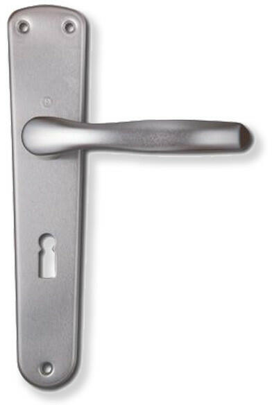 Hoppe Milano kulcsos kilincs garnitúra (F1) aluminium színben. Alkalmazható egyaránt balos és jobbos ajtókon is. Kiemelt méretként kezelendő az 55 mm, mely a kilincstengely és a kulcslyuk közötti távolságot jelöli.