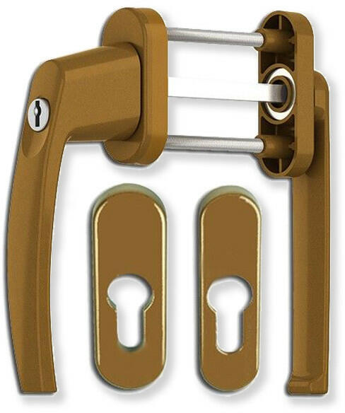 Erkélyajtóhoz való Victory lapított kulcsos kilincsgarnitúra bronz színben. A felszerelés során belülről rögzíthető 2 db átmenő csavarral, úgy, hogy a kilincstakaró lapot el kell fordítani 90°-ban a rögzítő lapról, majd a rögzítést követően vissza kell pattintani a lapot függőleges irányban. A tok és a rozetta összeütközése elkerülhető, ugyanis keskenyebb kial