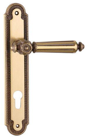 A kilinccsel színben egyező csavarok a csomag tartozékai. Egyedi megjelenésű kilincs. Aprólékosan kidolgozott formájával, antik színével, műemlék, műemlék jellegű épületekbe illeszthető.