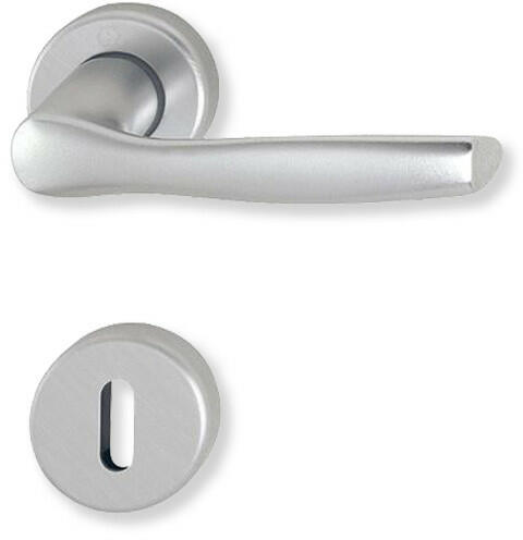 Hoppe Milano rozettás belsőajtó kilincsgarnitúra (F1) aluminium színben, kulcsos. A rozetta alsó része műanyag, rejtett csavarozás facsavarokkal. Alkalmazható egyaránt balos és jobbos ajtókon is.