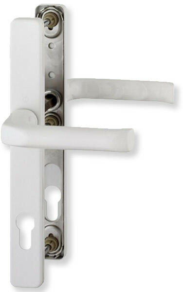 Nagyon eltrejedt furatképpel rendelkező fehér színű kilincs garnitúra. Kialakítása lehetővé teszi a kilincs felfelé történő elmozdulását, azaz felhúzását. 3 db átmenő csavarral rögzíthető a belső oldalról. Nincsen belőle balos és jobbos kivitel. Kiemelt méretként kezelendő a 92 mm, valamint a 3 furat elhelyezkedése. A csomag tartalma: 1 db külső és 1 db belső ki