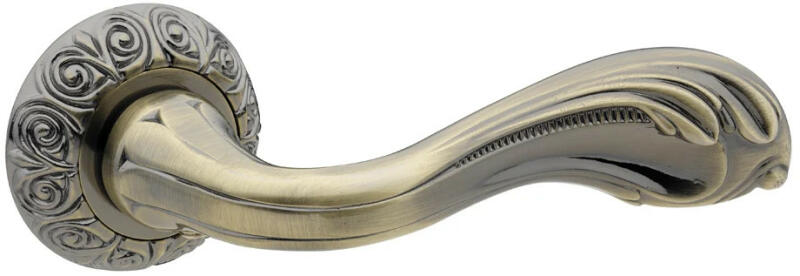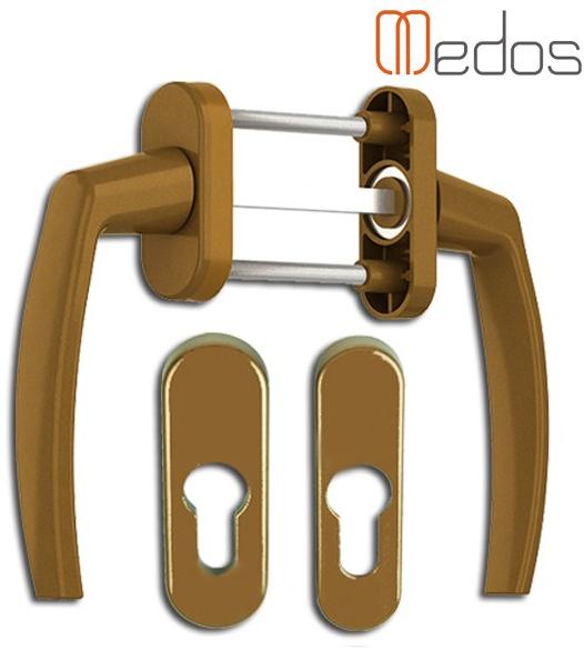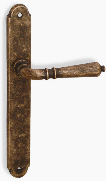 Erkélyajtó bronz kilincs garnitúra 2 db rozettával. A külső oldali rozetta és kilincs keskenyebb a belső oldalinál, hogy az ajtó bezárásakor a toknak ne ütközzön neki a rozetta, hanem elférjenek egymás mellett. 45°-ként került pozicionálásra a belső oldali kilincs. Belülről történik a rögzítése 2 db átmenő csavar segítségével, hogy a kilincsen lévő külső taka