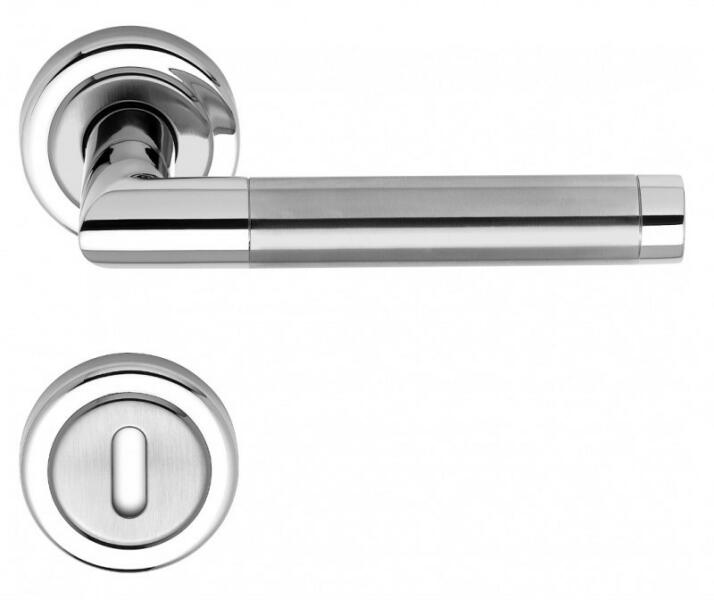 Rozettás rozsdamentes acél kilincs garnitúra. Metrikus menetes, átmenő csavaros (hüvelyes) a rögzítése, mely csavarok a felszerelést követően nem látszanak. A kilincs alaplapja rugót is tartalmaz, így a kilincs visszaemelése nem csak a zár feladata amelynél így hosszabb élettartam várható, valamint komfortosabban hat a működése. 72 vagy 90 mm-es zárral szerelt ajtókhoz j