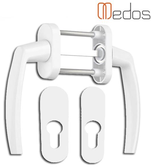 Erkélyajtó fehér kilincs garnitúra 2 db rozettával. A külső oldali rozetta és kilincs keskenyebb a belső oldalinál, hogy az ajtó bezárásakor a toknak ne ütközzön neki a rozetta, hanem elférjenek egymás mellett. 45°-ként került pozicionálásra a belső oldali kilincs. Belülről történik a rögzítése 2 db átmenő csavar segítségével, hogy a kilincsen lévő külső tak