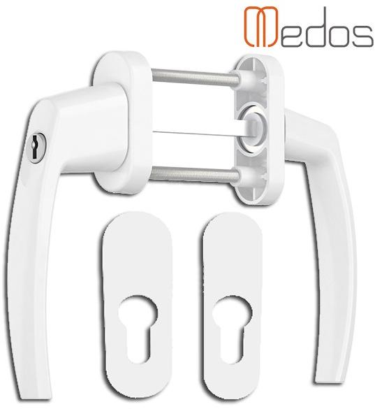 Victory kulcsos erkélyajtó kilincsgarnitúra, fehér színben, kettő darab oválrozettával. A garnitúrát 2 db átmenő csavarral belülről kell rögzíteni. A belső oldali kilincs a kulcs elfordítása után nyitható, zárása a gomb benyomásával történik, zárt állapotban kívülről nem nyitható az erkélyajtó. A külső oldali rozetta és a kilincs keskenyebb kivitelű, annak é