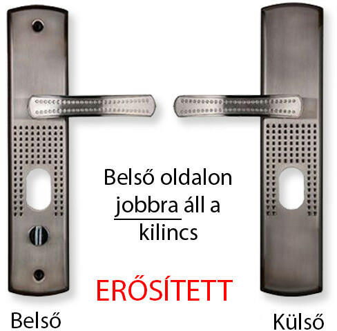 Jobbos ajtóhoz! Vagyis, a belső oldalon jobbra áll a kilincs, mint a fenti képen. Kínai acél biztonsági ajtóhoz való kilincs garnitúra párban, melynek a külső oldala erősített. Az "erősített" kifejezés esetében a külső oldali pajzsba épített acél merevítést jelenti, amely által a kilincs mindenfajta lefeszítési kísérlettel szemben ellenállóbb. A külső kilincs a k