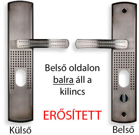 Balos ajtóhoz! Vagyis, a belső oldalon balra áll a kilincs, mint a fenti képen. Kínai acél biztonsági ajtóhoz való kilincs garnitúra párban, melynek a külső oldala erősített. Az "erősített" kifejezés esetében a külső oldali pajzsba épített acél merevítést jelenti, amely által a kilincs mindenfajta lefeszítési kísérlettel szemben ellenállóbb. A külső kilincs a kul