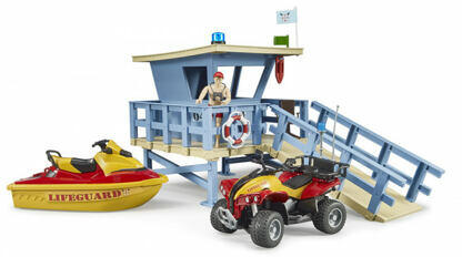 Parti őrség torony, négykerekű motorral, vízirobogóval és úszómesterrel - Bruder 62780 A vízben és a vízen való kikapcsolódás és sportolás nagyon fontos szabadidős tevékenység. A vízi sportok szerelmeseinek biztonságáról a vízimentő és a parti őrség torony gondoskodik. A vízimentő feladata, hogy felismerje és kiértékelje a veszélyes helyzeteket a vízben, és min