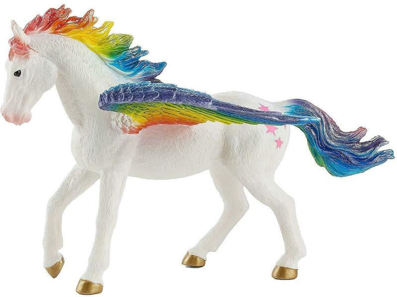 A pegazus egy szárnyas ló a görög mitológiában. Zeusz villámait szállítja, de számos hősi alak társául szegődött, ha a szükség úgy kívánta. Ez a példány különleges, szivárványos szárnyakkal és sörénnyel rendelkezik. Aranyszínű patája csillogó, a comb felső részén rózsaszín csillagok díszítik. A Mojo, az Animal Planettel karöltve, olyan minőségi állatfig