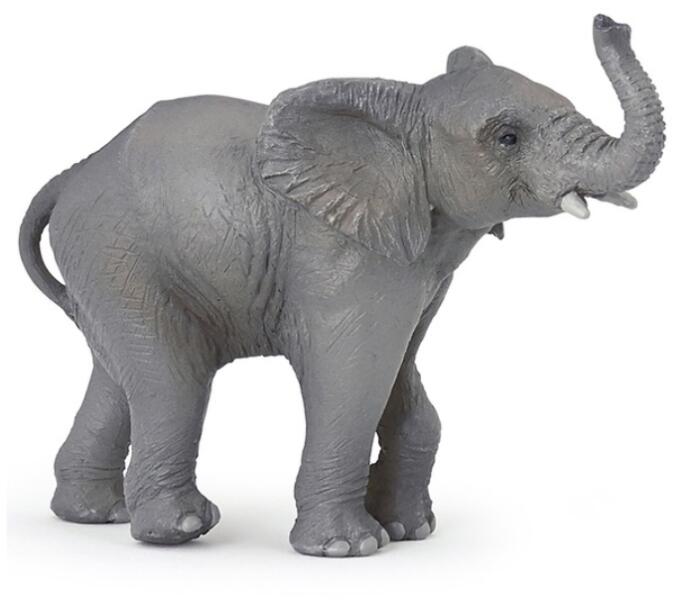 Élethű szürke elefánt figura, kacskaringós ormánnyal! Élethű szürke elefánt figura, kacskaringós ormánnyal! A Papo elefánt 50225 egy fiatalabb elefántborjú figura, részletgazdag kidolgozással, műanyagból kiöntve. A figura kézzel van festve, rövid fehér agyarai vannak, az elefánt együtt használható más figurákkal, Papo játékkészletekkel is. A Papo elefánt 50225 mér
