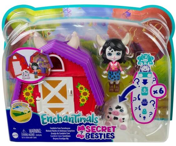 Gyermeke most Cambrie Cow farmjára látogathat el az EnchanTimals Harvest Hills telis-teli kuckó csomag által, ahol maga Cambrie és egy aranyos kis tehén is várja őt. A farmra a nyitható ajtón át lehet bejutni, azonban a kuckót magát is ki lehet nyitni , hogy a gyermekek bent is körülnézhessenek. A szénabálák és felszerelések mellett 2 tyúk is költi éppen a tojásait a házi
