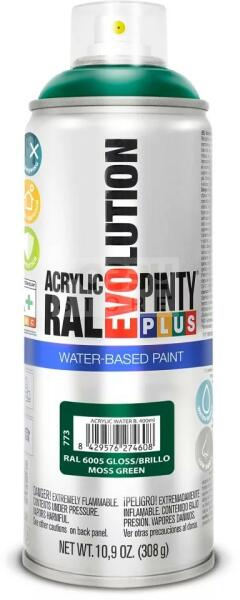 PINTYPLUS EVOLUTION VIZES BÁZISÚ AKRIL SPRAY- MOHAZÖLD- RAL6005 (MOSS GREEN) 400ML - PP773 A PintyPlus Evolution Water-based, vizes bázisú akril festék spray egy speciális festék azok számára, akinek fontos a környezet védelme. A vizes bázisú EVO spray termékcsalád univerzálisan használható, RAL színekben érhető el. Vizes bázisú spray , ezért bármilyen célra, bármilyen