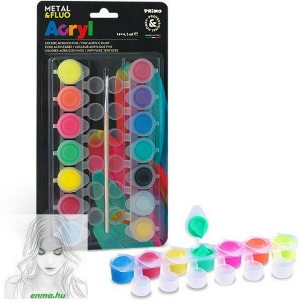 A Primo 1612T14Fm akrilfesték készlet 14 féle színnel, köztük 12 alapszínnel, fluoreszkáló és fémes árnyalatokkal, melyekkel könnyedén és kreatívan alkothatunk. A készlet kiváló minőségű, tartós és könnyen kezelhető festékei garantálják a professzionális eredményt. Az Akrilfesték Primo 1612T14Fm 14Db-Os Készlet 12+Fluo+Metallic 14X4,5 Ml egy kiváló minőségű, s
