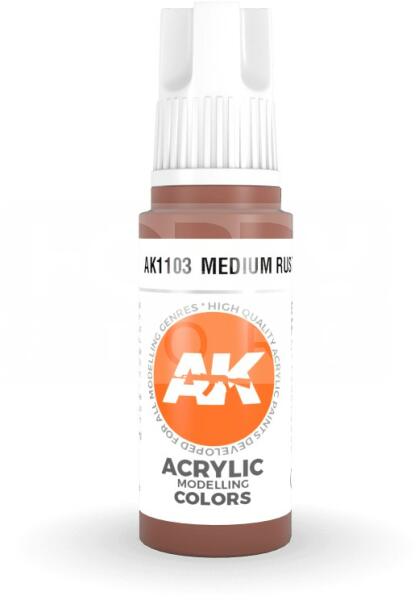 AK-Interactive - Acrylics 3rd generation Medium Rust 17ml - akrilfesték AK11103 Új formulával készült kiváló minőségű akrilfesték modellezéshez-makettezéshez. Új összetevőinek köszönhetően a festék szerkezete nem esik szét, ezzel elkerülhetjük a termék állása utáni hosszadalmas felrázási folyamatot. Kiválóan alkalmas ecsettel és airbrush-al történő alkalmazásra