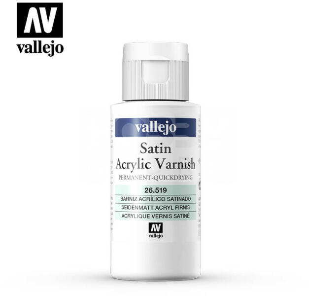 Vallejo Satin Acrylic Varnish 60 ml - szatén akril lakk 26519 A Vallejo Satin Acrylic Varnish gyors száradású és rendkívül jó keménységű szatén akril lakk. Megvédi a festett modelleket maketteket a karcolásoktól, szennyeződésektől és nedvességtől. UV álló. Felhordható ecsettel, lakkozó ecsettel vagy megfelelő hígítás után szórópisztollyal. Két rétegben érdemes al