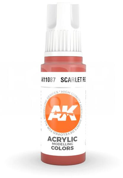 AK-Interactive - Acrylics 3rd generation Scarlet Red 17ml - akrilfesték AK11087 Új formulával készült kiváló minőségű akrilfesték modellezéshez-makettezéshez. Új összetevőinek köszönhetően a festék szerkezete nem esik szét, ezzel elkerülhetjük a termék állása utáni hosszadalmas felrázási folyamatot. Kiválóan alkalmas ecsettel és airbrush-al történő alkalmazásra