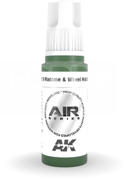 AK-Interactive Acrylics 3rd generation Radome & Wheel Hub Green AIR SERIES akrilfesték AK11919 Új formulával készült kiváló minőségű akrilfesték modellezéshez-makettezéshez. Új összetevőinek köszönhetően a festék szerkezete nem esik szét, ezzel elkerülhetjük a termék állása utáni hosszadalmas felrázási folyamatot. Kiválóan alkalmas ecsettel és airbrush-al tört