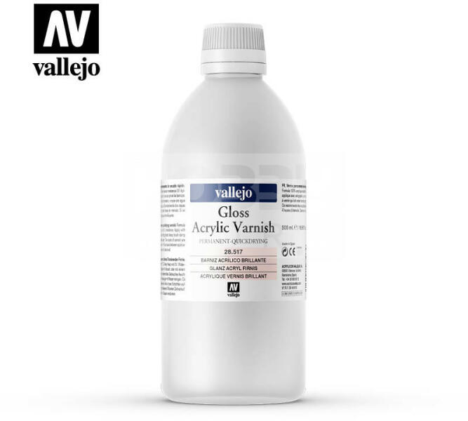 Vallejo Gloss Acrylic Varnish 500 ml - Fényes akril lakk 28517 A Vallejo Gloss Acrylic Varnish gyors száradású és rendkívül jó keménységű fényes akril lakk. Megvédi a festett modelleket maketteket a karcolásoktól, szennyeződésektől és nedvességtől. UV álló. Felhordható ecsettel, lakkozó ecsettel vagy megfelelő hígítás után szórópisztollyal. Két rétegben érdemes a