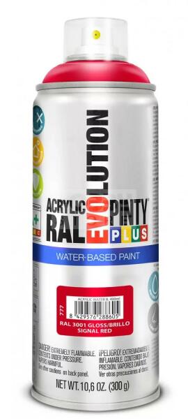 PINTYPLUS EVOLUTION VIZES BÁZISÚ AKRIL SPRAY- JELZŐ PIROS- RAL3001 (SIGNAL RED) 400ML - PP777 A PintyPlus Evolution Water-based, vizes bázisú akril festék spray egy speciális festék azok számára, akinek fontos a környezet védelme. A vizes bázisú EVO spray termékcsalád univerzálisan használható, RAL színekben érhető el. Vizes bázisú spray , ezért bármilyen célra, bármily