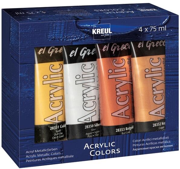 Metallikus akrilfestékek El Greco - Kreul / készlet 4 x 75 ml A híres német Kreul márka El Greco akrilfestékei nagyszerű segítséget nyújtanak az akrillal történő festéshez. Nagyon keresett és tanulók között a legnépszerűbb akrilfestékek közé tartozik. Vastag krémes állagúak és ideálisak reliéf vagy 3D-s hatások létrehozására a vásznon. Magas arányban tartalmaznak