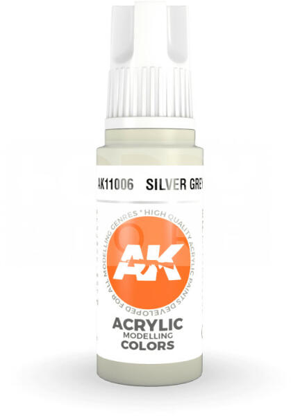 AK-Interactive - Acrylics 3rd generation Silver Grey 17ml - akrilfesték AK11006 Új formulával készült kiváló minőségű akrilfesték modellezéshez-makettezéshez. Új összetevőinek köszönhetően a festék szerkezete nem esik szét, ezzel elkerülhetjük a termék állása utáni hosszadalmas felrázási folyamatot. Kiválóan alkalmas ecsettel és airbrush-al történő alkalmazásra