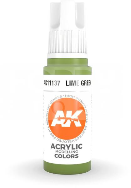 AK-Interactive - Acrylics 3rd generation Lime Green 17ml - akrilfesték AK11137 Új formulával készült kiváló minőségű akrilfesték modellezéshez-makettezéshez. Új összetevőinek köszönhetően a festék szerkezete nem esik szét, ezzel elkerülhetjük a termék állása utáni hosszadalmas felrázási folyamatot. Kiválóan alkalmas ecsettel és airbrush-al történő alkalmazásra i