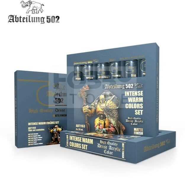 Abteilung 502 - Dense Paint - INTENSE WARM COLORS SET - sűrű akrilfesték szett 6X20ml ABT1163 Az Abteilung 502 Artis (Dense Paint) tubusos sűrű akrilfestékek olyan formulával rendelkeznek, hogy maximális fedést és takarást biztosítsanak, kombinálva a szín élénkségével és intenzitásával. Teljesen mattra száradnak. Kifejezetten figurafestők számára készült. Az Abteilung 50