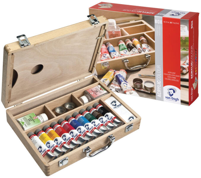 Talens Van Gogh akrilfesték - kezdő festőkészlet gyönyörű fadobozban Kiváló minőségű, sokoldalú akrilfesték, magas pigmenttartalommal. Nagy viszkozitás, rövid száradási idő jellemzi. Festőkéssel és/vagy ecsettel is felvihető, jól rétegezhető festék. A praktikus fadoboz lehetővé teszi a könnyebb szállítást, akár a szabadban festést is. Készlet tartalma:- 10 x 40