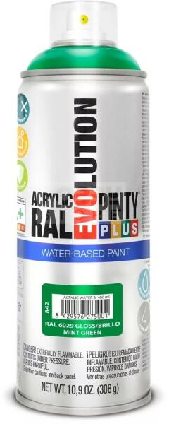 PINTYPLUS EVOLUTION VIZES BÁZISÚ AKRIL SPRAY- MENTAZÖLD- RAL6029 (MINT GREEN) 400ML - PP842 A PintyPlus Evolution Water-based, vizes bázisú akril festék spray egy speciális festék azok számára, akinek fontos a környezet védelme. A vizes bázisú EVO spray termékcsalád univerzálisan használható, RAL színekben érhető el. Vizes bázisú spray , ezért bármilyen célra, bármilyen