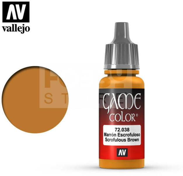 Vallejo Game Color Scrofulous Brown akrilfesték 72038 Magas pigmenttartalmú vízbázisú akrilfesték ecsettel történő használatra. A Vallejo Game Color festékek mindegyikét fantáziafigurákra és dioráma készítésre szakosodott modellfestőkkel fejlesztették ki. A Game Color festékek fejleszésénél figyelembe vették, hogy jórészt asztali wargame társasjátékok használói fog