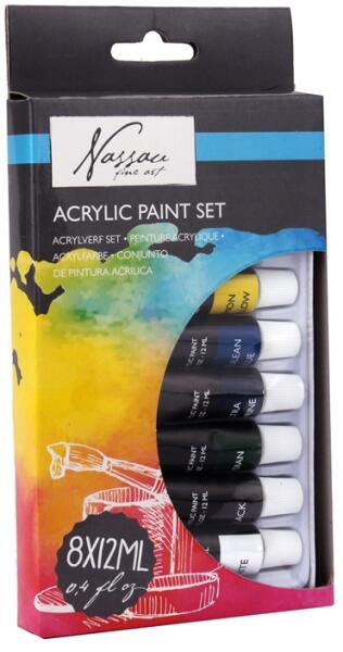 Akrilfesték készlet Nassau Fine Art 8 x 12 ml Nassau Fine Art akrilfestékek 100% akrilgyanta alapúak és gyorsan száradnak. Krémes állagúak és koncentrált nagyon erős minőségű pigmentek. Ezek könnyen kombinálódnak, hogy más színek végtelen árnyalatát hozzák létre. Vízzel hígítva és egy vékonyabb rétegben felhordva akvarell hatást kapnak. A Nassau akrilfestékeket nag