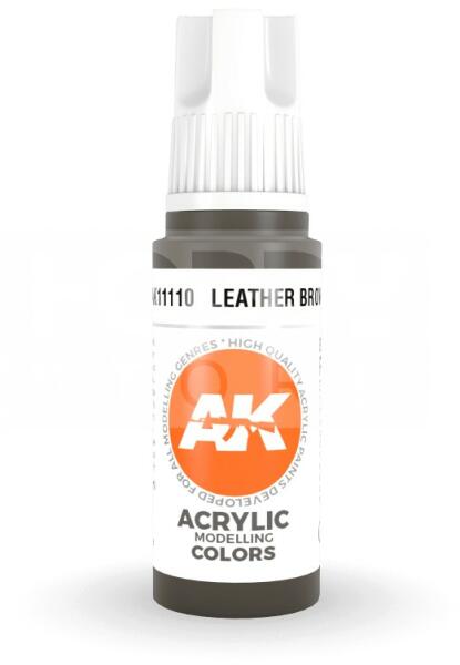 AK-Interactive - Acrylics 3rd generation Leather Brown 17ml - akrilfesték AK11110 Új formulával készült kiváló minőségű akrilfesték modellezéshez-makettezéshez. Új összetevőinek köszönhetően a festék szerkezete nem esik szét, ezzel elkerülhetjük a termék állása utáni hosszadalmas felrázási folyamatot. Kiválóan alkalmas ecsettel és airbrush-al történő alkalmazásr