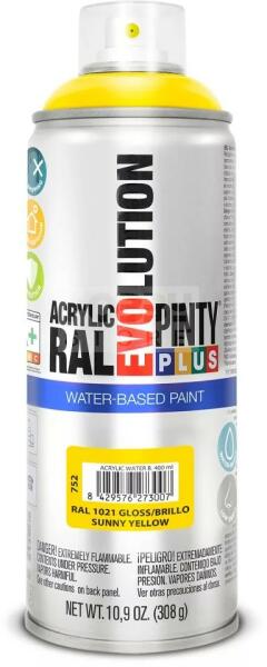 PINTYPLUS EVOLUTION VIZES BÁZISÚ AKRIL SPRAY- NAPSÁRGA- RAL1021 (SUNNY YELLOW) 400ML - PP752 A PintyPlus Evolution Water-based, vizes bázisú akril festék spray egy speciális festék azok számára, akinek fontos a környezet védelme. A vizes bázisú EVO spray termékcsalád univerzálisan használható, RAL színekben érhető el. Vizes bázisú spray , ezért bármilyen célra, bármilye