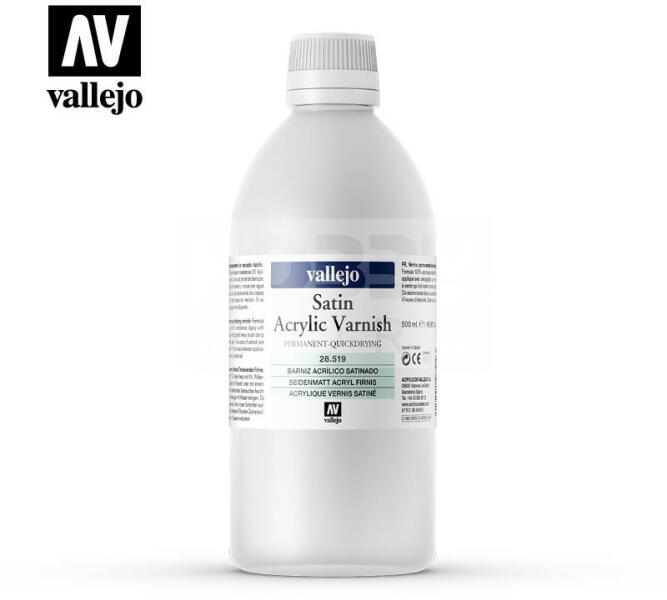 Vallejo Satin Acrylic Varnish 500 ml - szatén akril lakk 28519 A Vallejo Satin Acrylic Varnish gyors száradású és rendkívül jó keménységű szatén akril lakk. Megvédi a festett modelleket maketteket a karcolásoktól, szennyeződésektől és nedvességtől. UV álló. Felhordható ecsettel, lakkozó ecsettel vagy megfelelő hígítás után szórópisztollyal. Két rétegben érdemes a