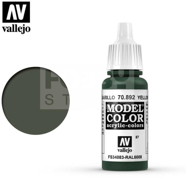 Vallejo Model Color Yellow Olive akrilfesték 70892 Magas pigmenttartalmú vízbázisú akrilfesték ecsettel történő használatra. A Vallejo Model Color széria nagyon kiterjedt magába foglalva az alapvető árnyalatokat, valamint számos történelmi színt illetve jármű és repülőgépek modellekhez használt katonai színek. Speciális effektek eléréséhez megtalálható a palettán f