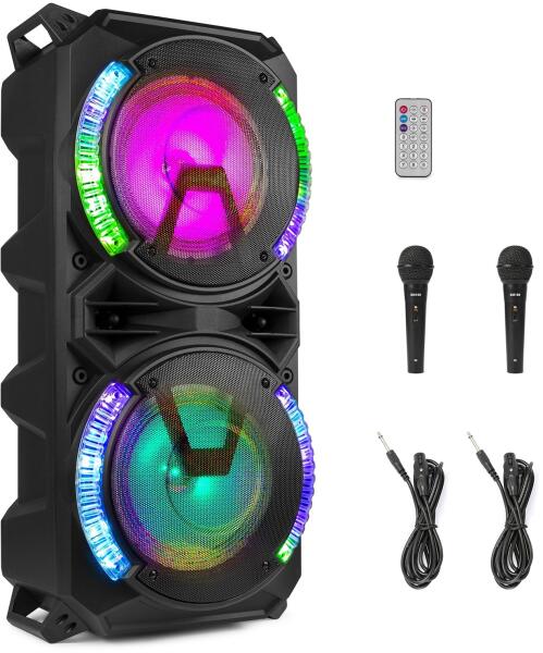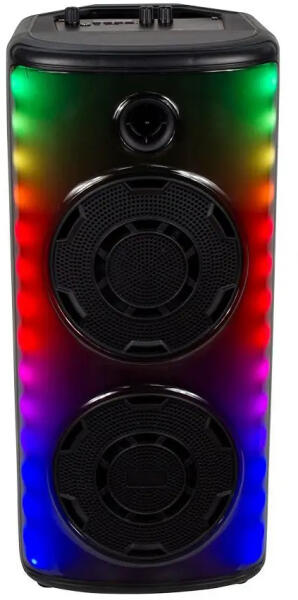 Soundor karaoke hangfalak Kapcsolható RGB világítással rendelkező, görgős, könnyen hordozható karaoke hangfalak, mikrofonnal. A készlet akkumulátort is tartalmaz, mellyel 2-4 óráig használható hálózati feszültség nélkül. Bluetooth, USB pendrive, SD kártya bemenet, távirányító. USB töltő a csomag része. Akkus - görgős karaoke hangszóró 2 db 2.8" Ki és bekapcsolhat