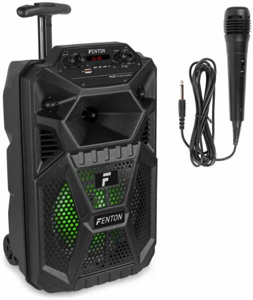 Fenton FPC8T 100W akkumulátoros karaoke hangfal (Mikrofon + MP3 + Bluetooth) Hivatalos magyarországi forgalmazótól. Leírás: Élvezze a mély és hangos zenét, vagy énekeljen barátaival ezzel az FPC8T hordozható KARAOKE party hangszóróval. Csatlakozzon Bluetoothon keresztül, használjon MicroSD-kártyát/USB-pendrive-ot, vagy csatlakoztasson egy 3,5 mm-es audiokábelt a készülékéhe