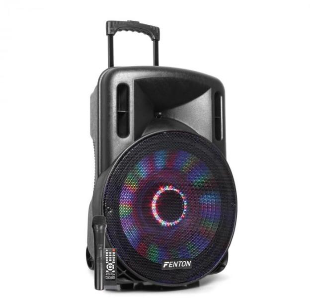 Fenton FT15LED (15") 800W akkumulátoros hordozható hangfal (1xMik + MP3 + Bluetooth) Hivatalos magyarországi forgalmazótól. Leírás: A Fenton FT15LED a gyártó egy egyszerűbb kialakítású, műanyag dobozos, akkumulátoros aktív hangfala. Különlegessége hogy a hangszóró körül beépített LED világítással látták el. A zene ritmusára, több színben tud villogni a hangfal, ez