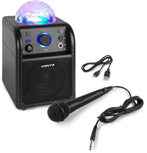 Műszaki adatok: - Típus: Vonyx SBS50B - Szín: fekete - Beépített BLUETOOTH lejátszó - Beépített akkumulátor - Üzemelési idő: 4-6 óra - Töltés: 5V mikro USB-n keresztül - Tartozék USB kábel - 1x 6,3 mm Jack külső mikrofon bemenet - Tartozék 1 db vezetékes mikrofon - Kapcsolható visszhang effekt a mikrofonra - Teljesítmény: 50W - Frekvencia: 30 Hz - 20.000 Hz - 3,5 mm Jack