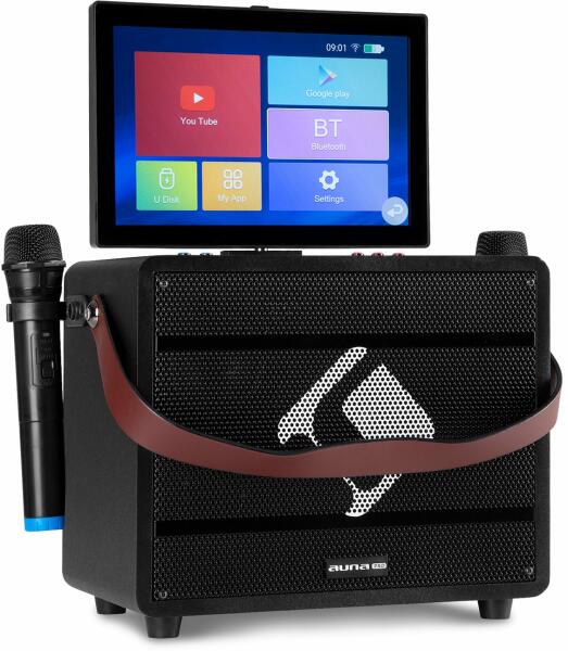 A hordozható szíjnak, a nagy érintőképernyőnek, a 2 vezeték nélküli UHF mikrofonnak és a hosszú élettartamú akkumulátornak köszönhetően az auna Pro Spin 8 karaoke rendszere ideális rendszer minden karaoke szerelmesének. Az auna Pro Spin 8 karaoke rendszerének legfontosabb eleme a 12,1 hüvelykes színes érintőképernyő. Fel- és visszahajtható, használatra vár, és tartó
