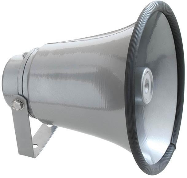 H-10K típusú hangszóró/megafon H-10K fogantyúval. Specifikációk: - Teljesítmény: 25W - Ellenállás: 8Ohm - Frekvenciatartomány: 400Hz-5KHz - Hatékonyság: SPL 105 dB - Méretek: átmérő: 260 mm hossz: 228 mm - Súly: 1,15 kg - Anyag: alumínium