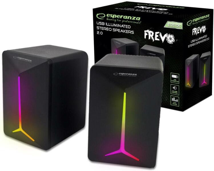Kiváló hangélmény és látványos megjelenés Az Esperanza EGS105 FREVO 2.0 RAINBOW LED asztali hangszóróval egyedülálló hangélményben és látványos megjelenésben lehet részed. Kiváló minőségű hangzással és lenyűgöző LED háttérvilágítással rendelkezik, amely fokozza az audiovizuális élményt. Erőteljes hangszórók és precíz hangminőség Az EGS105 FREVO hangszó