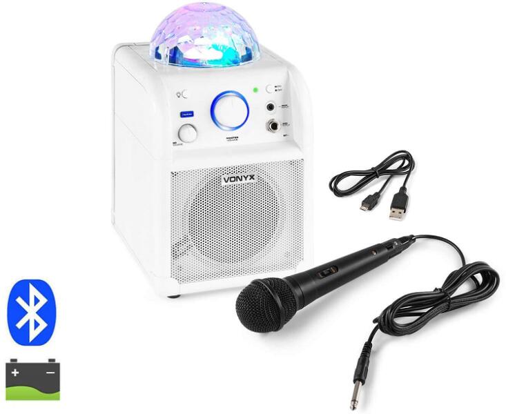 Vonyx SBS50W akkumulátoros hordozható hangfal 50W (1xMik + Bluetooth + LED Ball) Hivatalos magyarországi forgalmazótól. Leírás: A Vonyx SBS50W egy kifejezetten könnyedén hordozható, akkumulátoros karaoke hangfal. Beépített Bluetooth kapcsolatának köszönhetően megoldható hogy akár laptopról vagy mobiltelefonról kábeles kapcsolat nélkül hallgassuk a zenéinket. A Bluetooth ha